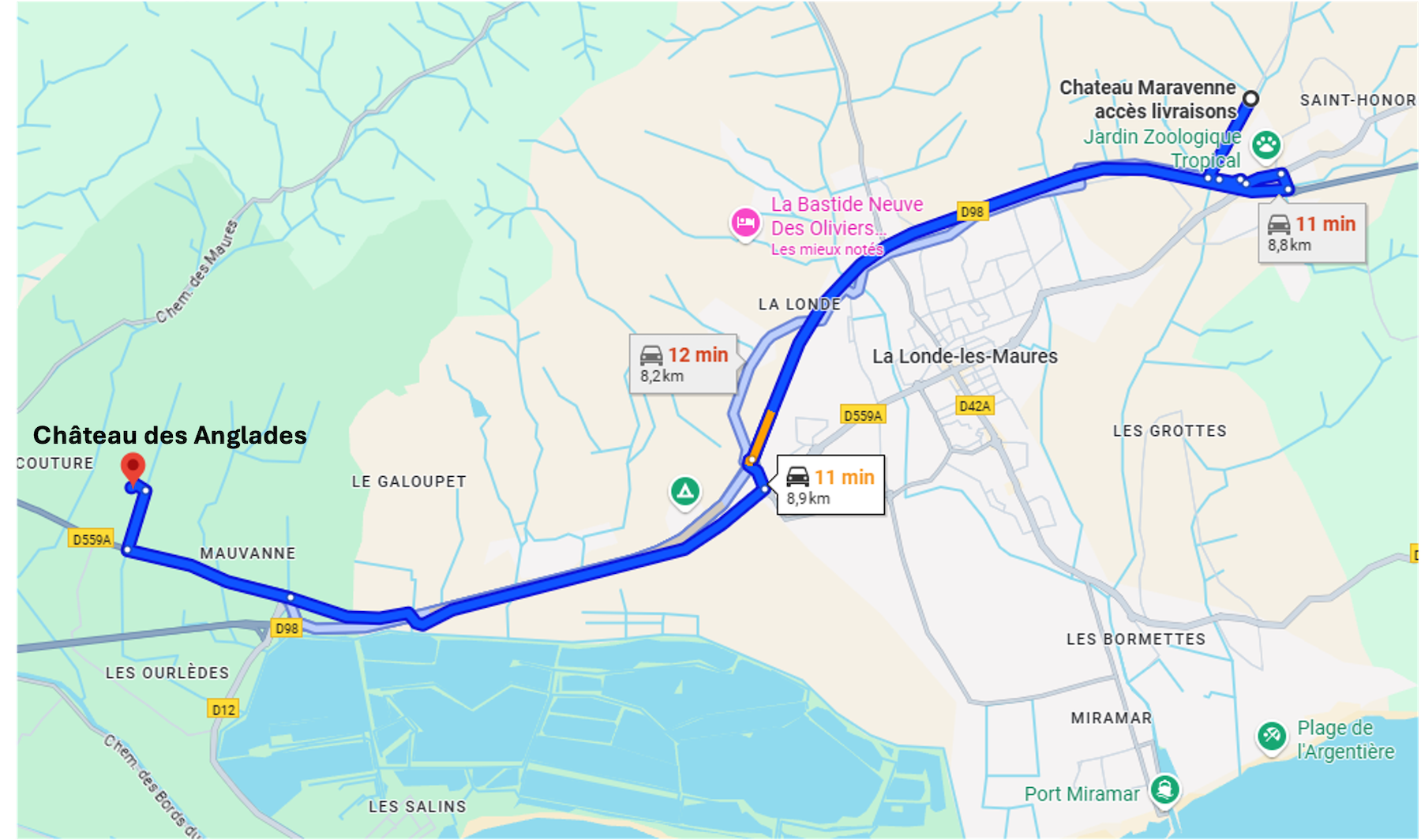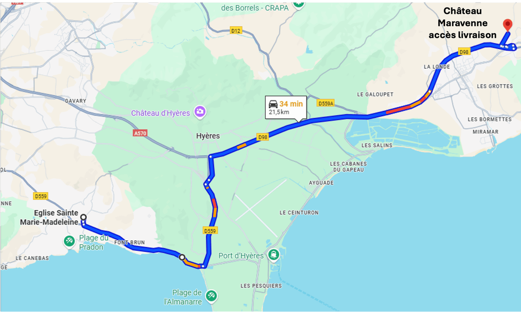 Afin d’accéder aux parkings prévus pour le lieu des festivités (Parking 1 Syrah & parking 2 Cave), nous vous recommandons d’indiquer sur le GPS «Château Maravenne accès livraison » (477 Route de Valcros, 83250 La Londe-les-Maures).